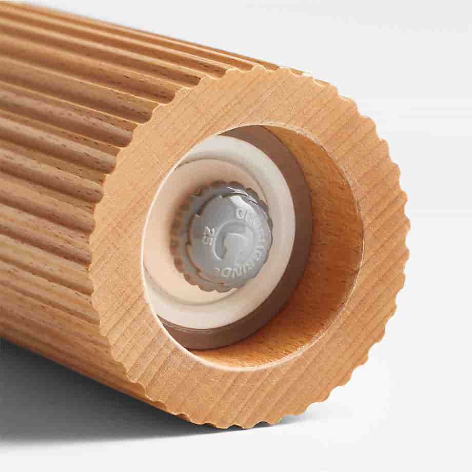 Natural beechwood shapes sculptural salt and pepper mills that evoke ancient Greek columns by way of modern Scandinavian design. Fluted on its upper half and smooth below, the pepper mill differentiates itself from the coordinating salt grinder in a satisfyingly tactile way. The adjustable porcelain mechanisms crush salt chunks and peppercorns as they grind to fully release flavors and aromas. As the debossed logos attest, our Handmade fluted pepper and salt grinders are Augusta's Cookware exclusives.